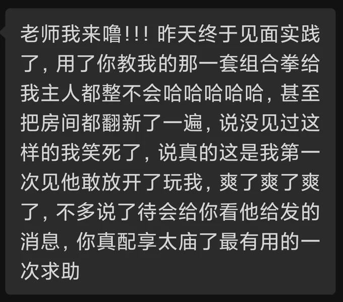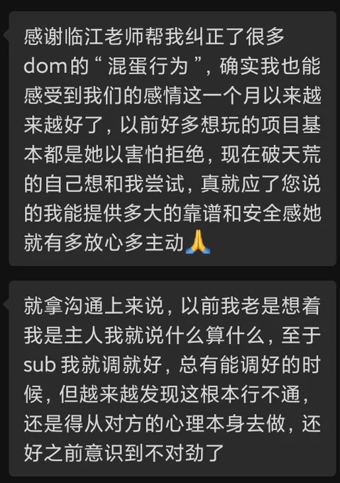 从d/s两个视角来的教学反馈 很多时候玩的上限不是取决于你对对方说“你很安全”或靠某些pua话术就能强迫着对方玩,而是一个又一个行为细节决定的 了解对方的顾虑和担心,耐心寻找能让彼此都舒适的方式,很多人觉得调教很简单就是输出,但连最基本的行为逻辑和心理活动都琢磨不明白,那ta肯定给你来一句“我觉得你掌控不了我”