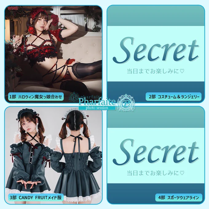 🎃11月2日(日) Pharfaite撮影会🎃 今年も出演させていただきます✨️ 各部の衣装は画像をご覧ください🫶 2部、4部は新作衣装をお借りするので 当日まで内緒です…!お楽しみに! 申込は明日の4日、20時開始です📣 たくさん撮りに会いに来てくださいね😽