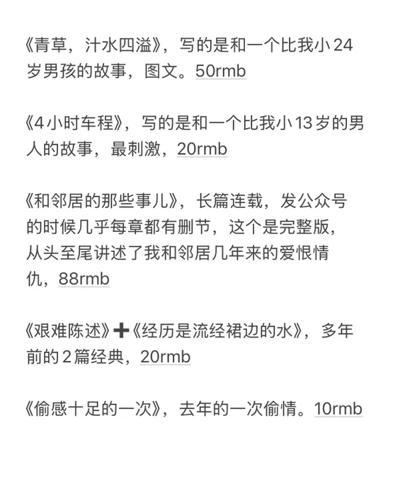 目前就这几个文章。 应该都挺好看。 贵在真实。 第一个图文。 其他虽然没有图,也很好看。 后续我还会写,同时也会整理旧文,把以前不好写的给写出来。 所以有我微信的,就别删,有新文了,会第一时间和大家分享,有偿哈,毕竟挺费脑子的,哈哈。
